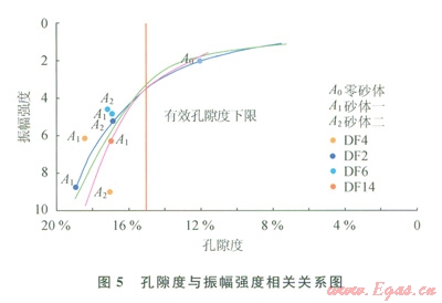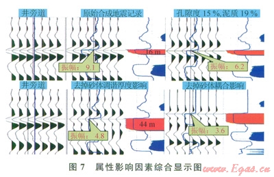 研究結(jié)果顯示(圖5),泥質(zhì)含量增加后,總孔隙度隨之降低,巖石速度及密度也應(yīng)該隨之增加。即當(dāng)儲(chǔ)層物性變差,儲(chǔ)層反射強(qiáng)度降低。如圖5所示,多口井測(cè)井曲線擬合趨勢(shì)基本相同。將各井實(shí)鉆儲(chǔ)層頂面振幅其他因素的影響剔除后,實(shí)鉆振幅值與正演模擬趨勢(shì)基本吻合。證明該規(guī)律可以代表真實(shí)物性變化條件下的地震反射變化情況。同時(shí),該研究結(jié)果可以將地震振幅大小與物性下限(15%)相對(duì)應(yīng),當(dāng)不受調(diào)諧及其他因素影響的時(shí)候,真實(shí)氣層頂面反射振幅在3.5左右。所以對(duì)振幅強(qiáng)度低于3.5的區(qū)域在儲(chǔ)量計(jì)算時(shí)基于風(fēng)險(xiǎn)考慮,儲(chǔ)量級(jí)別相應(yīng)降低。