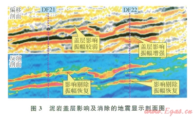 DFl3氣田平面分布達(dá)數(shù)百平方千米,儲(chǔ)層、蓋層橫向上變化較大。受沉積速度、厚度及壓實(shí)不均影響,泥巖蓋層的速度及密度在空間上存在較大差異。由此導(dǎo)致同一套氣層具有完全不同的地震響應(yīng)特征。當(dāng)存在致密泥巖蓋層時(shí),致密泥巖旁瓣的波谷會(huì)與氣層頂面的波谷疊加,導(dǎo)致氣層頂面出現(xiàn)異常“亮點(diǎn)”;相反,當(dāng)蓋層是一套相對(duì)低阻抗泥巖時(shí)(本區(qū)蓋層阻抗均高于儲(chǔ)層),氣層頂面反射相應(yīng)減弱,從而導(dǎo)致對(duì)儲(chǔ)層含氣性的誤判。
