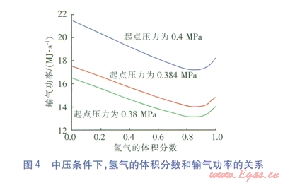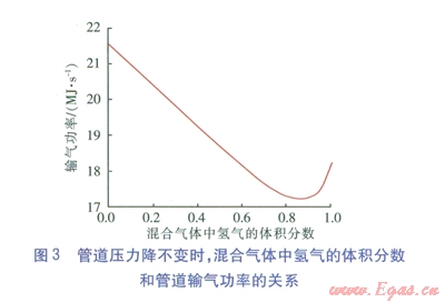 由圖3可知,氫氣加入到天然氣管道后,若保證壓力降不變,則無論氫氣的體積分?jǐn)?shù)為多大,和輸送天然氣相比,管道的輸氣功率均是下降的,即管道的輸氣能力是降低的。當(dāng)氫氣在混合氣體中的體積分?jǐn)?shù)大于0.83后,管道的輸氣功率有小幅回升,但和輸送天然氣相比,管道的輸氣能力仍然是下降的。在圖1中也有相類似的情況,當(dāng)氫氣在混合氣體中的體積分?jǐn)?shù)為0.83左右時,混合氣體的華白數(shù)是最低的。