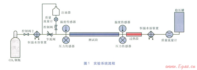 為了測(cè)試C0:一PAG油混合物(以下簡稱混合物)水平光滑管內(nèi)流動(dòng)沸騰換熱特性,筆者設(shè)計(jì)搭建了實(shí)驗(yàn)臺(tái)(見圖l)。實(shí)驗(yàn)臺(tái)采用開式系統(tǒng),C02從鋼瓶中流出進(jìn)入恒溫水浴裝置進(jìn)行溫度調(diào)節(jié)和控制,模擬C02制冷系統(tǒng)中氣體冷卻器出口狀態(tài)。通過節(jié)流閥對(duì)C02進(jìn)行流量控制,并使節(jié)流閥出口處的C02以液霧形式出現(xiàn)。在節(jié)流閥出口設(shè)置注油器,通過管道連接節(jié)流閥入口和出口,產(chǎn)生壓差,連同重力作用,注油器內(nèi)的潤滑油可連續(xù)注入節(jié)流閥出口管內(nèi),并與C02充分混合。注油器出口安裝流量計(jì),以測(cè)量潤滑油注入流量,控制閥1可調(diào)節(jié)PAG油注人流量。然后混合物進(jìn)入測(cè)試段(模擬蒸發(fā)器)。為準(zhǔn)確控制并測(cè)量C02的質(zhì)流密度(C02質(zhì)量流量與管內(nèi)截面積之比),在鋼瓶出口設(shè)置控制閥2(用于控制C02質(zhì)量流量),在測(cè)試段出口設(shè)置過熱段與恒溫水浴裝置(使C02完全氣化)及質(zhì)量流量計(jì)。
