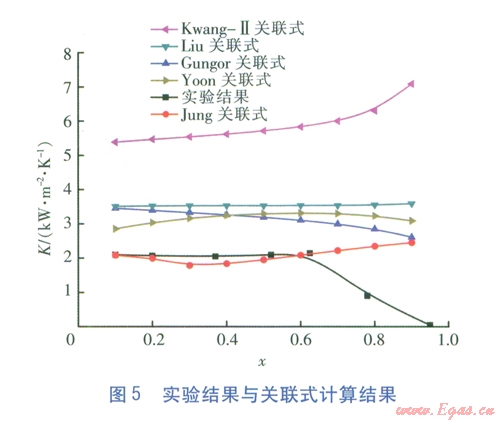 筆者選取5種經(jīng)典換熱關(guān)聯(lián)式,將本次設(shè)定實(shí)驗(yàn)條件(PAD油的質(zhì)量分?jǐn)?shù)固定為0.75%)作為已知計(jì)算條件,比較實(shí)驗(yàn)結(jié)果與換熱關(guān)聯(lián)式計(jì)算結(jié)果,從中篩選出適于計(jì)算混合物水平光滑管內(nèi)流動(dòng)沸騰換熱系數(shù)的傳熱關(guān)聯(lián)式。