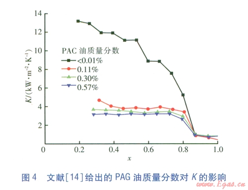 圖4與圖3類似,在低干度區(qū),C02主要以液態(tài)形式存在,對(duì)PAG油的溶解度較大,表現(xiàn)為PAG油質(zhì)量分?jǐn)?shù)對(duì)K的影響很大。隨著工質(zhì)干度的增大,尤其干涸發(fā)生以后,氣態(tài)C02的比例增大,氣態(tài)C02對(duì)PAG油的溶解性很差,大部分PAG油析出,PAG油質(zhì)量分?jǐn)?shù)不再是影響K的決定因素。最終,無油工況與含油工況的K趨于一致。