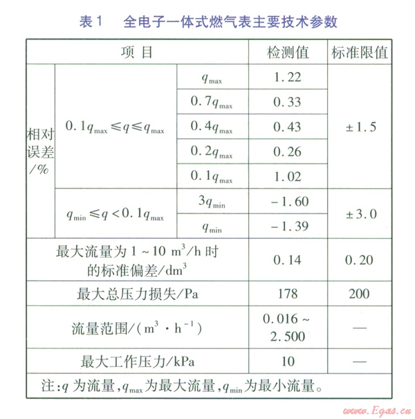 全電子一體式燃?xì)獗硗ㄟ^了無錫市計(jì)量測(cè)試中心對(duì)精確度、重復(fù)性、總壓力損失的檢測(cè),取得了校準(zhǔn)證書。因目前沒有相應(yīng)的標(biāo)準(zhǔn),只能參照膜式燃?xì)獗淼臉?biāo)準(zhǔn),其技術(shù)指標(biāo)均達(dá)到GB/T6968-2011《膜式燃?xì)獗怼?span lang="EN-US">1.5級(jí)表的要求,主要技術(shù)參數(shù)見表l。