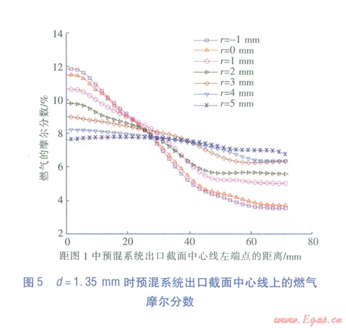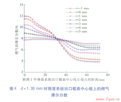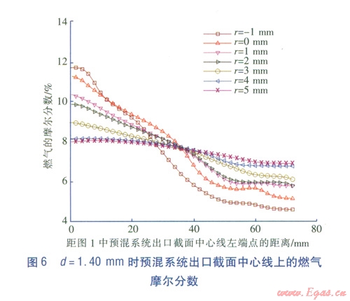 不同噴嘴直徑d 和噴嘴位置條件下,預(yù)混系統(tǒng)出口截面中心線上混合氣中燃氣的摩爾分數(shù)見圖4~6可知,當(dāng)r=-1mm和r=0mm時,中心線上燃氣摩爾分數(shù)的不一致性非常明顯,摩爾分數(shù)波動范圍為4%~12%。R越大,中心線上的燃氣的摩爾分數(shù)一致性越好。當(dāng)r=4mm和5mm時,中心線上燃氣的摩爾分數(shù)幾乎相同,這說明此條件下混合效果比較好。因此,為了實現(xiàn)燃氣和空氣的完全預(yù)混,取r>4mm。