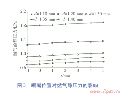模擬的噴嘴位置對燃氣靜壓力的影響見圖3。由圖3可知,噴嘴的直徑越小,燃氣所需要的靜壓力越大。當(dāng)噴嘴的直徑d<1.30mm時,燃氣的靜壓力大于1.0kPa。因此噴嘴的直徑應(yīng)大于1.30mm,否則電磁閥后(燃氣噴嘴前)燃氣的質(zhì)量流量將不能滿足燃燒器熱負荷的要求。