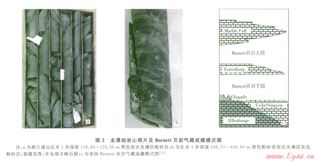 從表l中可以看出,龍?zhí)督M頁(yè)巖的TOC、R0、厚度以及地層的頂?shù)钻P(guān)系都較Lewis頁(yè)巖有更好的頁(yè)巖氣前景,而且從地層的頂?shù)钻P(guān)系來(lái)看(表1),與美國(guó)Barnett頁(yè)巖所處的地層格局(圖2-c)有很大的相似性,有利于頁(yè)巖氣的后期保存。