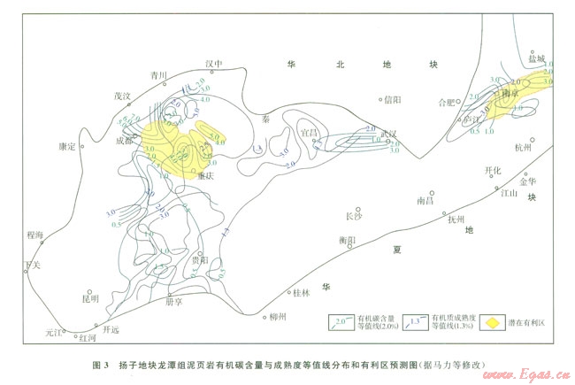 2)綜合分析以上要素后認(rèn)為,龍?zhí)督M頁(yè)巖氣成藏條件縱向上看:中、上段優(yōu)于下段,橫向上頁(yè)巖氣的有利地區(qū)為上揚(yáng)子川中、川東、渝西北和下?lián)P子蘇南地區(qū)。
