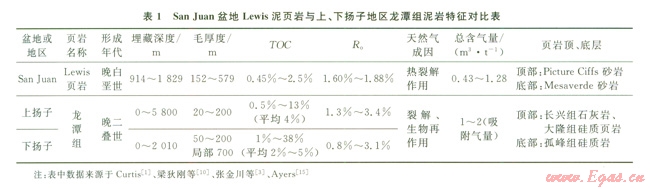 揚(yáng)子地區(qū)龍?zhí)督M頁(yè)巖與美國(guó)San Juan盆地Lewis頁(yè)巖的沉積環(huán)境十分相似,故將各類參數(shù)進(jìn)行對(duì)比總結(jié)(表1)。