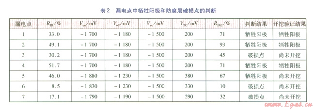 如果RIRC大于等于0.6,則可判斷此處金屬表面防腐層的電阻很小,預(yù)測(cè)為犧牲陽極;如果RIRC>1,則不排除此處管道上伴隨有防腐層破損情況;如果RIRC小于0.6,則表明此處金屬表面防腐層的絕緣電阻還比較大,可以判斷為防腐層破損。此處的0.6是一個(gè)經(jīng)驗(yàn)性數(shù)值,按此判斷是否精準(zhǔn),還需要更多的實(shí)踐來證實(shí)。根據(jù)此方法,對(duì)7處漏電點(diǎn)的判斷結(jié)果見表2。