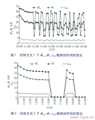 由圖l、2可知,對于控制方式1、2,在開始階段,Фex、Фr均比較接近,說明這兩種控制方式下土壤的初始條件大致相同。由于兩種控制方式下,地埋管換熱器、地板輻射供暖系統(tǒng)的流量基本保持不變,因此測試階段Pex,p、Pr,p也基本保持不變。由實測數(shù)據(jù)可計算得到,Pex,p、Pr,p的平均值分別為l.88、1.47 kW,單臺壓縮機運行時Php的平均值為3 kW,兩臺壓縮機運行時Php的平均值為5.5 kW。由此可知,在兩種控制方式下,Pex,p、Pr,p占聯(lián)合供暖系統(tǒng)耗電功率的比例都比較高。
