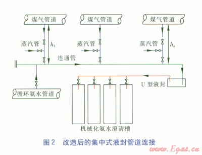 層為焦油,下層為焦油渣,沉淀在槽底的焦油渣由刮板輸送機(jī)排出槽外,焦油則通過(guò)液面調(diào)節(jié)器流至焦油槽,澄清后的氨水經(jīng)上部溢流至循環(huán)氨水槽,送往后續(xù)工段使用。改造后的集中式液封管道連接見(jiàn)圖2。