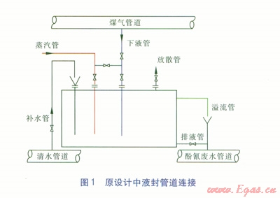 按原設(shè)計(jì),煤氣輸送主管道上的附屬液封一期有6個(gè)(其余液封為設(shè)備專(zhuān)用液封)、二期有8個(gè)(其余液封為設(shè)備專(zhuān)用液封);每個(gè)液封都設(shè)有放散管、下液管、溢流管、排液管及蒸汽管等附屬管道,所有下液最后經(jīng)溢流管流至酚氰廢水管道匯合至污水處理站。原設(shè)計(jì)中液封管道連接見(jiàn)圖l。