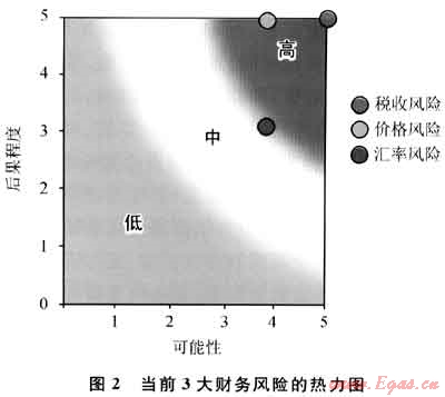 對稅收風(fēng)險(xiǎn)、價(jià)格風(fēng)險(xiǎn)、匯率風(fēng)險(xiǎn)等前3大風(fēng)險(xiǎn)進(jìn)一步進(jìn)行問卷調(diào)查。統(tǒng)計(jì)得出各風(fēng)險(xiǎn)采取應(yīng)對措施后剩余風(fēng)險(xiǎn)的后果和可能性分值(風(fēng)險(xiǎn)事件可能性和后果評分采用5分制);將剩余風(fēng)險(xiǎn)的后果和可能性分值相乘,得到剩余風(fēng)險(xiǎn)值,并繪制成風(fēng)險(xiǎn)的熱力圖(圖2)。