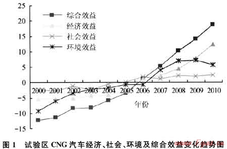 通過構(gòu)建社會、經(jīng)濟和環(huán)境效益的評價指標和指標體系,采用主成分分析法對試驗區(qū)CMG汽車城際化運行進行經(jīng)濟、社會、環(huán)境及綜合效益評價。主成分分析法是把原來多個變量轉(zhuǎn)化為少數(shù)幾個綜合指標的一種統(tǒng)計分析方法,即用較少的幾個綜合指標來代替原來較多的變量指標,而且使這些較少的綜合指標既能盡量多地反映原來較多指標所反映的信息,同時它們之間又彼此獨立[2]。通過收集歷年CNG汽車產(chǎn)業(yè)統(tǒng)計資料數(shù)據(jù),建立了以CNG汽車產(chǎn)業(yè)總產(chǎn)值、利稅總額等10個經(jīng)濟效益評價指標,CNG產(chǎn)業(yè)燃油替代量、新增就業(yè)人數(shù)等5個社會效益評價指標,CNG汽車C0、CO2減排量等7個環(huán)境效益指標,用分車型各個排放因子的檢測數(shù)據(jù)統(tǒng)計平均值,對汽車尾氣各因子的排放量和減排量的測算分析,試驗區(qū)經(jīng)濟效益、社會效益、環(huán)境效益和綜合效益評價結(jié)果見圖1。結(jié)果表明,在2000—2010年間,試驗區(qū)CNG汽車產(chǎn)業(yè)發(fā)展的綜合效益一直呈現(xiàn)增長趨勢,由-12.4302增長到18.81287;經(jīng)濟效益由-5.51459增長到12.41559;社會效益的變化則比較平緩,由-2.32735增長到2.356 903;環(huán)境效益由-9.3076增加到5.57548。