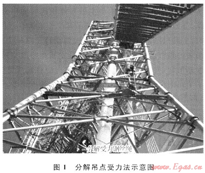 根據(jù)放空火炬塔架的結(jié)構(gòu)特點,整體吊裝放空火炬的吊點最適合設(shè)置在距塔架底部42m的塔架橫梁處,該處的塔架主肢為乃450mm×12mm鋼管,橫梁為Φ159mm×6mm無縫鋼管。為了在吊耳梁上安裝能滿足吊裝要求的吊耳,需將Φ159mm×6mm橫梁更換為DN400mm或DN350mm的厚壁鋼管,但現(xiàn)場只有Φ356mm×16mm(20號鋼)的無縫鋼管,且土庫曼斯坦資源匱乏,無法采購到合適的吊耳梁材料,從國內(nèi)采購、運輸?shù)闹芷谟趾荛L,無法滿足工期要求。經(jīng)計算,若采用Φ356mm×16mm的無縫鋼管制作吊耳梁,其與吊耳相貫處的彎曲應(yīng)力達到586MPa,是其許用應(yīng)力(137MPa)的4倍多,達不到吊裝要求。在此情況下,經(jīng)過技術(shù)論證和可行性研究,決定使用Φ356mm×16mm的無縫鋼管制作吊耳梁,并采用分解吊點受力的方法,以降低吊耳梁的彎矩和應(yīng)力。具體方法是用鋼絲繩把吊耳和吊點下部34m標高的塔架主肢節(jié)點連接起來,并對鋼絲繩施加3t預(yù)拉力,將超過吊耳梁承受能力的吊裝負荷通過鋼絲繩傳遞到34m標高的塔架主肢節(jié)點上,鋼絲繩的大小通過超載負荷計算得出。分解吊點受力法示意圖如圖1所示。