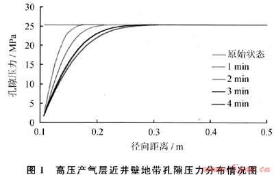 從圖1可以看出,高壓氣層一旦被氣體鉆井揭開后,近井壁地帶孔隙壓力分布發(fā)生明顯變化。井壁表面巖石孔隙壓力與井筒內(nèi)壓力相等,隨著距井壁表面距離的增加,孔隙壓力逐漸增加,直至恢復原始地層孔隙壓力。