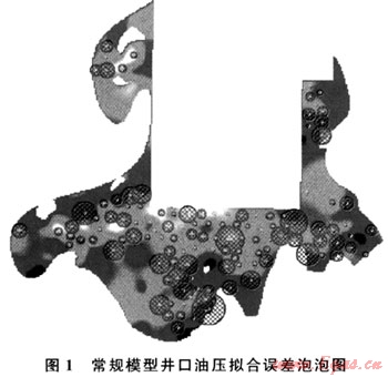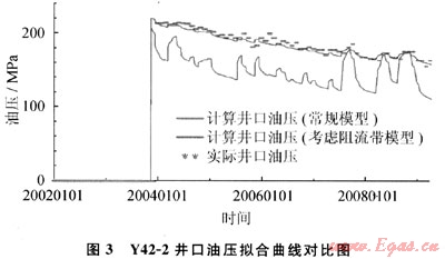 歷史擬合是對(duì)地質(zhì)模型參數(shù)場(chǎng)的修正,也是對(duì)地質(zhì)再認(rèn)識(shí)的過程。常規(guī)模型歷史擬合調(diào)參前井口油壓擬合較好的井有24口,占所有氣井的比例為18.2%,且多數(shù)井模型計(jì)算壓力較實(shí)際壓力偏高;考慮阻流帶的模型壓力擬合較好的井約有72口,所占比例達(dá)到54.5%,多數(shù)井計(jì)算壓力與實(shí)際壓力更加接近,空間擬合誤差對(duì)比圖見圖1、2。此外,阻流帶的引入還克服了歷史擬合參數(shù)調(diào)整有時(shí)范圍較大、不合理的弊端。Y42-2井試井解釋滲透率為0.4mD,表皮系數(shù)為-5.8,邊界面積1.71km2。常規(guī)模型需要將滲透率減小,油壓才能基本擬合上,且曲線變化趨勢(shì)仍然與實(shí)際存在較大偏差,顯然這種修改是不符合實(shí)際的。引入阻流帶以后,將滲透率減小為原來的50%,油壓迅速擬合到實(shí)際水平,壓力變化趨勢(shì)與實(shí)際相符(圖3),這也從另一方面證實(shí)了阻流帶的存在。由此可見,考慮阻流帶之后歷史擬合工作變得更加容易,部分井甚至不需要調(diào)參即可完成擬合,進(jìn)一步證實(shí)了阻流帶模型的可靠性。值得注意的是:并不是所以井之間都存在阻流帶,還應(yīng)結(jié)合井間干擾分析成果,對(duì)部分井間連通區(qū)域進(jìn)行修改。通過反復(fù)修改參數(shù)場(chǎng),對(duì)每口井進(jìn)行了壓力和產(chǎn)水的擬合,得到模型最終計(jì)算儲(chǔ)量710.9×108m3,與地質(zhì)儲(chǔ)量719.21×108m3相差不大,誤差在5%以內(nèi),認(rèn)為修正后的模型能夠基本代表氣藏實(shí)際[8]。
