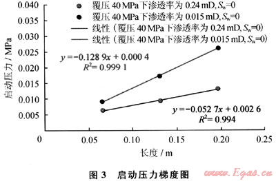 從圖1和圖2均可以得出,啟動壓力與巖心長度之間存在函數(shù)關(guān)系,即