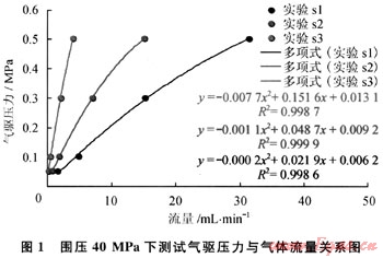 第二步:連接氣源,采用調(diào)壓閥設(shè)置氣驅(qū)壓力從低壓(0.05MPa)開始逐級增壓(0.1MPa,0.2MPa,0.3MPa,0.4MPa,0.5MPa,0.6MPa,…,5.0MPa)進(jìn)行氣驅(qū),每個壓力點氣驅(qū)時間在1.0h以上直至氣流量穩(wěn)定,采用皂沫流量計或者高精度電子流量計測試氣體流量,高精度壓力傳感器記錄壓力。