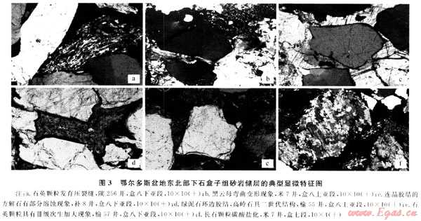 指松散沉積物在上覆水體和沉積物負荷壓力作用下發(fā)生總體積縮小和孔隙度降低的一種成巖作用方式,是儲層形成過程中一種主要的破壞性成巖作用。鄂爾多斯盆地東北部下石盒子組砂巖儲層的埋藏深度大,機械壓實作用強,埋藏史模擬得出的最大古埋深介于3000~4100m之間(早白堊世末)[7],當前埋藏深度介于2000~3300m之間。顯微鏡下砂巖呈顆粒支撐,顆粒間以線接觸為主,部分呈點-線接觸或凹凸狀接觸;石英或巖屑等剛性碎屑發(fā)育壓實作用形成的脆性微裂紋和壓溶現(xiàn)象(圖3-a);云母碎屑、千枚巖、泥巖巖屑等塑性顆粒被壓實變形(圖3-b),甚至呈假雜基充填顆粒間。這些現(xiàn)象表明砂巖儲層經歷了較強的壓實作用。強烈的壓實作用不但喪失了大部分的原生孔隙,也不利于次生孔隙孔隙的保存,是研究區(qū)砂巖儲層致密化的一個重要因素。