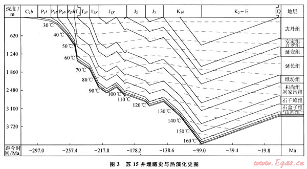 蘇里格地區(qū)在燕山中晚期由于構(gòu)造熱事件的發(fā)生,古地溫梯度較高,介于3.6~4.0℃/100m,早白堊世末以來(lái),燕山構(gòu)造熱事件消失,地溫梯度下降為現(xiàn)今的2.8~3.0℃/100m。晚白堊世以來(lái),一方面地溫梯度逐漸降低,另一方面,地層抬升和剝蝕又進(jìn)一步使地層溫度降低。通過盆地模擬計(jì)算,蘇里格氣田盒8段從早白堊世末期到現(xiàn)今,由最高古地層溫度從170℃降低到110~120℃,地層溫度大約平均降低了50℃(圖3)。假設(shè)氣藏自早白堊世末至今不存在氣體的散失和注入,根據(jù)理想氣體熱力學(xué)方程計(jì)算,地層壓力降低到原來(lái)的86.5%。