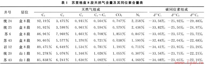 具體證據(jù)為:①盒8段與下伏烴源巖發(fā)育的山西-本溪組的氣層壓力仍基本相似,均屬于異常低壓;②盒8段儲(chǔ)層含氣飽和度與地層壓力系數(shù)的關(guān)系也不明顯;③該區(qū)內(nèi)盒8段天然氣組成和碳同位素與下伏山西組基本相似(表1)。