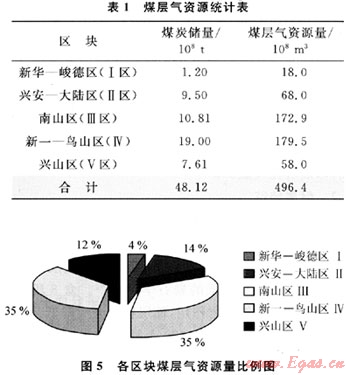 鶴崗礦區(qū)煤炭資源豐富,主要分布于1500m以淺。筆者以垂深1500m為界線,將鶴崗礦區(qū)劃分為5個(gè)區(qū)塊,分別對(duì)其煤層氣資源量進(jìn)行預(yù)測(cè):煤炭?jī)?chǔ)量共有48.12×104t,含氣量為7~16m3/t,預(yù)測(cè)煤層氣資源量為496.4×108m3(表1)。其中南山區(qū)(Ⅲ區(qū))和新一-鳥山區(qū)(Ⅳ區(qū))為主要含氣區(qū),資源量分別為172.9×108m3和179.5×108m3,占1500m以淺煤層氣總資源量的70%(圖5)[5]。