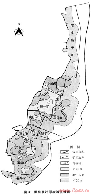 對(duì)125口井的煤層累計(jì)厚度進(jìn)行了統(tǒng)計(jì),煤層累計(jì)厚度為30~70m。從全區(qū)煤層發(fā)育情況來看,橫向上煤層連續(xù)性較好,但厚度上具有多個(gè)聚煤中心,其中大于40m的主要分布在新一、南山礦(分布面積為24.2km2)和興安、峻德礦的局部地區(qū)(分布面積為5.5km2);石頭廟子礦區(qū)煤層發(fā)育較差,厚度一般小于10m(圖3)。在南山、新一礦煤層厚度較大,直接決定了煤層氣生成及吸附能力較其他礦區(qū)強(qiáng),導(dǎo)致瓦斯涌出量相對(duì)偏高。