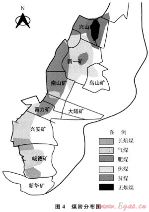 例如峻德、興安礦區(qū)主要為氣煤和長(zhǎng)焰煤,興安北部的富力、大陸、南山礦變?yōu)榉拭?,至新一礦深部、鳥山區(qū)變?yōu)榻姑?,再向北分布有貧煤和無煙煤(圖4)。因此煤變質(zhì)程度較高的南山、新一礦煤層瓦斯含量相應(yīng)增高,使得礦井瓦斯涌出量較大,屬高瓦斯突出礦區(qū)。