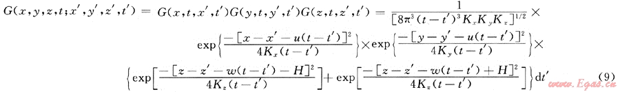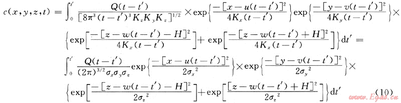 根據(jù)動態(tài)泄漏率不定常的特點,以氣體動力學(xué)理論和湍流擴散微分方程為基礎(chǔ),結(jié)合相應(yīng)的初始條件和邊界條件,利用格林函數(shù)進(jìn)行推導(dǎo),可得綜合擴散模型格林函數(shù)為: