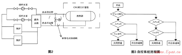 根據(jù)計(jì)算值,循環(huán)水供水溫度不低于21.9℃即可,因此時(shí)循環(huán)水溫度在46℃左右,為簡化控制流程,可在供回水管上設(shè)置一只等徑旁路閥,分流經(jīng)過換熱器的流量,并根據(jù)燃?xì)獬隹跍囟戎祦砜刂婆月烽y的開啟或關(guān)閉,以實(shí)現(xiàn)溫度的自動控制。