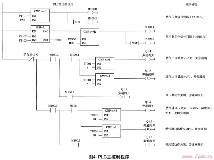 自動系統(tǒng)需要4個(gè)開關(guān)量信號:燃?xì)膺M(jìn)口壓力開關(guān)信號(動作值12MPa);二級調(diào)壓器前后差壓開關(guān)信號(動作值0);燃?xì)獬隹跍囟刃盘?動作值20℃);燃?xì)獬隹跍囟刃盘?動作值5℃)。輸入開關(guān)量信號采用原系統(tǒng)自有的模擬量輸入信號(一級調(diào)壓器前壓力和燃?xì)獬隹跍囟?,通過PLC控制程序(比較模塊)實(shí)現(xiàn)3個(gè)開關(guān)量信號。輸出信號有2個(gè):旁通閥開啟信號,旁通閥關(guān)閉信號。