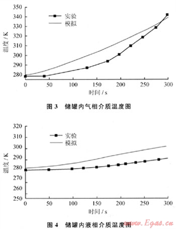 圖3、4分別為氣相介質(zhì)和液相介質(zhì)的溫度響應(yīng)過程,計(jì)算值與實(shí)驗(yàn)值吻合較好,最大誤差分別為4.5%和4%。其中,氣相取距離儲罐頂部50mm處的介質(zhì)溫度,液相取距離儲罐底部200mm處介質(zhì)的溫度。由圖3和圖4對比可知,液相介質(zhì)的溫度升高較氣相介質(zhì)緩慢,300s內(nèi)氣相介質(zhì)和液相介質(zhì)的溫度分別升高了63K和11K。原因在于一方面蒸汽的比熱容遠(yuǎn)小于液相的[2];另一方面液相介質(zhì)過熱后會通過相變將熱量轉(zhuǎn)化到氣相,使得液相介質(zhì)本身儲存的熱量較少。