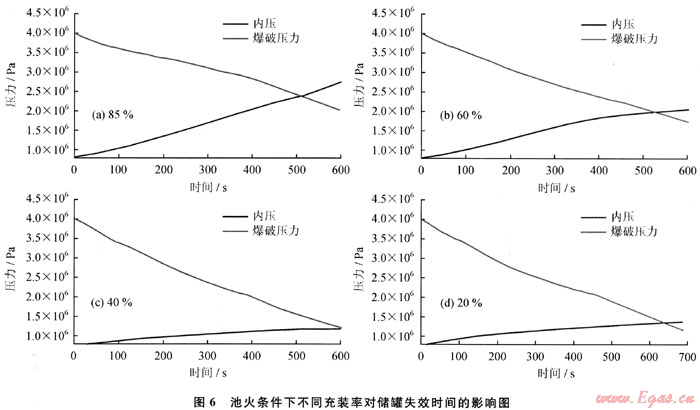3) 池火作用下,LPG儲罐失效受到兩個因素控制,一是介質(zhì)溫度升高導(dǎo)致的儲罐內(nèi)介質(zhì)壓力升高,二是氣相區(qū)壁溫升高導(dǎo)致的強(qiáng)度下降。兩條曲線的交叉點(diǎn)即為儲罐的失效點(diǎn)。儲罐內(nèi)介質(zhì)的充裝率越高,儲罐失效時間越短。