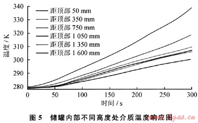 圖5所示為儲罐內(nèi)不同高度處介質(zhì)的溫度響應(yīng)規(guī)律??梢钥闯觯鼗鹱饔孟聝迌?nèi)部存在熱分層現(xiàn)象,溫度總體呈現(xiàn)上高下低的趨勢。本文所模擬的LPG儲罐的初始充裝率為72%,對應(yīng)的氣液分界面位于距儲罐頂部540mm處??梢?,氣相溫度明顯高于液相,且距離液面越遠(yuǎn)氣相溫度越高,說明氣相除了通過相變吸熱外,還通過氣相壁面吸收輻射熱量;另外,在距離儲罐頂部1350mm以下的液相區(qū),介質(zhì)溫度降低明顯,說明過冷液體區(qū)與液相分層區(qū)[2]的分界面可能位于此處附近。