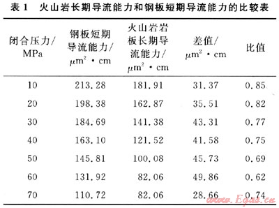 在閉合壓力一定的情況下,火山巖巖板長(zhǎng)期導(dǎo)流能力比鋼板短期導(dǎo)流能力低28.66~49.86ftm2·cm,火山巖巖板長(zhǎng)期導(dǎo)流能力和鋼板短期導(dǎo)流能力之比值為0.62~0.85。不同閉合壓力下的兩者的比值也不一樣(表1)。因此為了得到準(zhǔn)確的長(zhǎng)期導(dǎo)流能力巖板的長(zhǎng)期導(dǎo)流能力實(shí)驗(yàn)是必要的。以往的國(guó)內(nèi)壓裂設(shè)計(jì)在沒(méi)有長(zhǎng)期導(dǎo)流能力實(shí)驗(yàn)系統(tǒng)的情況下,有經(jīng)驗(yàn)的壓裂設(shè)計(jì)人員經(jīng)常取短期值的1/3作為計(jì)算機(jī)程序設(shè)計(jì)軟件的輸入數(shù)據(jù),以此來(lái)降低因?qū)Я髂芰Σ钪翟斐傻挠?jì)算結(jié)果的誤差。