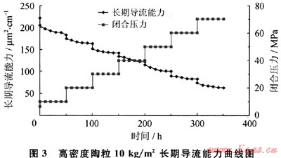 長(zhǎng)期導(dǎo)流能力的實(shí)驗(yàn)條件均考慮了地層溫度、地層鹽水的影響,為了實(shí)際考察支撐劑嵌入地層的影響,使用了火山巖巖板。實(shí)驗(yàn)連續(xù)運(yùn)轉(zhuǎn),實(shí)驗(yàn)時(shí)間超過(guò)300h。