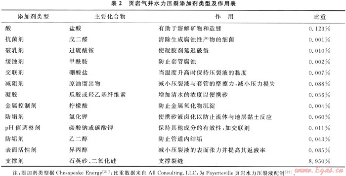 無(wú)論是在頁(yè)巖氣開(kāi)發(fā),還是在常規(guī)油氣開(kāi)發(fā)的壓裂過(guò)程中,壓裂液及其性能都是影響壓裂最終效果的重要因素。壓裂液及其性能對(duì)能否造出一條足夠尺寸的、有足夠?qū)Я髂芰Φ牧芽p有直接關(guān)系。清水壓裂液組成以水和砂為主,含量占總量的99%以上,其他添加劑成分占?jí)毫岩嚎偭康牟蛔?%。添加劑在壓裂液中所占的比例很小,但對(duì)提高頁(yè)巖氣井的產(chǎn)量說(shuō)卻是至關(guān)重要。頁(yè)巖水力壓裂常見(jiàn)添加劑類型及其作用見(jiàn)表2。