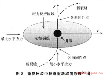 重復(fù)壓裂是指當(dāng)頁(yè)巖氣井初始?jí)毫烟幚硪呀?jīng)無(wú)效或現(xiàn)有的支撐劑因時(shí)間關(guān)系損壞或質(zhì)量下降,導(dǎo)致氣體產(chǎn)量大幅下降時(shí),采用壓裂工藝對(duì)氣井經(jīng)行重新壓裂增產(chǎn)的工藝。頁(yè)巖氣井初始?jí)毫押?,?jīng)過(guò)一段時(shí)間的生產(chǎn),井眼周圍的應(yīng)力會(huì)發(fā)生變化,重復(fù)壓裂能夠重新壓裂裂縫或使裂縫重新取向,使頁(yè)巖氣井產(chǎn)能恢復(fù)到初始狀態(tài)甚至更高(圖3)。美國(guó)Barnett頁(yè)巖在1995年前廣泛使用凝膠壓裂,1997年開(kāi)始發(fā)展清水壓裂,作業(yè)者對(duì)先前使用凍膠壓裂增產(chǎn)產(chǎn)量下降的井使用清水壓裂重新改造,改進(jìn)處理液回收工作流程,氣井產(chǎn)量明顯提高,部分井產(chǎn)量甚至超過(guò)了初次壓裂時(shí)的產(chǎn)量[5]。