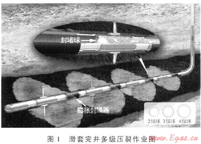 多級(jí)壓裂是利用封堵球或限流技術(shù)分隔儲(chǔ)層不同層位進(jìn)行分段壓裂的技術(shù)。多級(jí)壓裂能夠根據(jù)儲(chǔ)層的含氣性特點(diǎn)對(duì)同一井眼中不同位置地層進(jìn)行分段壓裂,其主要作業(yè)方式有連續(xù)油管壓裂和滑套完井兩種。多級(jí)壓裂技術(shù)是頁(yè)巖氣水力壓裂的主要技術(shù),在美國(guó)頁(yè)巖氣生產(chǎn)井中,有85%的井是采用水平井和多級(jí)壓裂技術(shù)結(jié)合的方式開(kāi)采,增產(chǎn)效果顯著。美國(guó)Newfield公司在Woodford頁(yè)巖中的部分開(kāi)發(fā)井采用了5~7段式的分段壓裂,頁(yè)巖氣單井最大初始產(chǎn)量達(dá)到28.32×104m3/d,最大最終產(chǎn)量達(dá)16.99×104m3/d[1]。