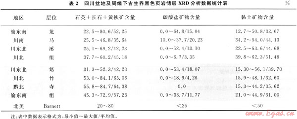 北美地區(qū)Barnett頁巖的石英、長石和黃鐵礦含量為20%~80%(其中石英含量為40%~60%),碳酸鹽礦物含量低于25%,黏土礦物含量通常小于50%。四川盆地下古生界2套頁巖的X射線熒光衍射(XRD)分析結(jié)果總體與Barnett頁巖相似(圖1、表2),其石英、長石和黃鐵礦的平均含量為30%~64%,碳酸鹽礦物的平均含量低于20%,極少數(shù)為0,黏土礦物含量平均在31%~51%。與Barnett頁巖對比,龍馬溪組的硅質(zhì)含量偏少,筇竹寺組的含量偏多,但龍馬溪組的碳酸鹽礦物含量較高,而筇竹寺組的含量偏少。研究表明,石英等脆性礦物含量高有利于后期的壓裂改造形成裂縫;碳酸鹽礦物中方解石含量高的層段,易于溶蝕產(chǎn)生溶孔。