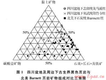 美國5大含氣頁巖的有機(jī)碳含量均較高,其中Barnett頁巖有機(jī)碳含量介于2.0%~7.0%,平均為4.5%,Antrim頁巖和New Albany頁巖有機(jī)碳含量部分超過20%,吸附氣含量最低為13%,最高可達(dá)70%(表1)。筆者依據(jù)四川盆地最新淺井及露頭分析資料,對該區(qū)下寒武統(tǒng)筇竹寺組和下志留統(tǒng)龍馬溪組頁巖進(jìn)行分析,結(jié)果顯示筇竹寺組有機(jī)碳含量為1.0%~11.07%,普遍大于1%;龍馬溪組的有機(jī)碳含量一般分布在0.51%~4.88%,最高可達(dá)9%左右。可以推測,四川盆地下古生界2套頁巖吸附氣含量應(yīng)該是較高的。
