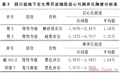 四川盆地頁巖儲層物性分析取得部分孔隙度資料,因滲透率測試靈敏度低未測出。資2井筇竹寺組黑色粉砂質(zhì)頁巖樣品物性分析孔隙度分布在1.0%~2.5%,平均孔隙度為1.58%;資3井硅質(zhì)頁巖的孔隙度為0.12%~0.70%。威001-2井筇竹寺組頁巖儲層的測井孔隙度在0.69%~3.08%,平均值為1.64%,滲透率在0.001~0.11mD,平均值為0.019mD[12~15]。陽深2井龍馬溪組測井解釋孔隙度一般為1.0%~5.0%(表5)。陽63、隆32等井在龍馬溪組已測試獲氣流,可見,四川盆地下古生界頁巖具備儲集條件。