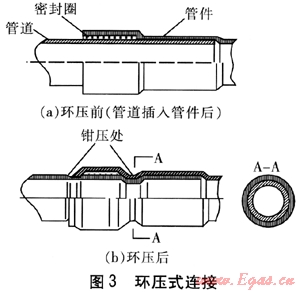 卡壓式連接是將“0”型密封圈,用專用卡壓工具壓入連接處,鉗壓后斷面呈六邊形的一種擠壓式連接方式。其優(yōu)點是操作方便,易于安裝;缺點是連接強度不夠高,抗外力能力差??▔菏竭B接見圖2。