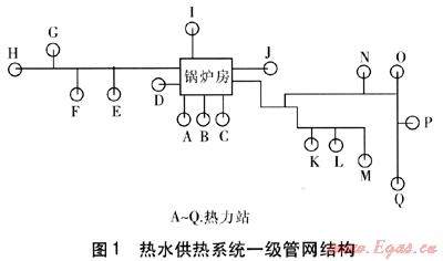 該供熱系統(tǒng)采用燃煤鍋爐房集中供熱,提供熱水、蒸汽兩種供熱介質(zhì),總供熱面積為132.02×104m2,其中熱水供熱面積為104.8×104m2。本次測量對象為熱水供熱系統(tǒng),采用間接連接,調(diào)節(jié)方式為質(zhì)調(diào)節(jié)。熱水供熱系統(tǒng)包括17座熱力站,其中有6座小區(qū)熱力站,11座樓宇熱力站,一級管網(wǎng)結(jié)構(gòu)見圖1。一級管網(wǎng)是隨著不同建筑的建設(shè)分期敷設(shè)的,新舊管網(wǎng)交錯布置,采用閉式雙管系統(tǒng),布置成枝狀管網(wǎng)。一級管網(wǎng)采用的保溫材料包括礦棉、復(fù)合硅酸鹽、聚氨酯,敷設(shè)方式有管溝和直埋兩種,大部分采用管溝敷設(shè)。