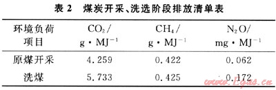 根據(jù)本文參考文獻(xiàn)[4]的統(tǒng)計(jì),煤炭在開(kāi)采、洗選(包括坑口附近的短距離運(yùn)輸)階段的排放清單如表2。