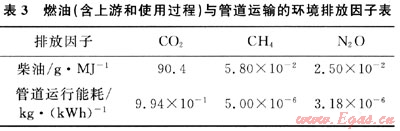 運(yùn)輸階段的污染物排放主要來(lái)自于燃料燃燒(汽油和柴油)的排放。不同的運(yùn)輸方式,其燃料種類、能源強(qiáng)度及燃料燃燒排放系數(shù)均不同。其中,汽車(chē)、油輪、貨船和火車(chē)的單位載重單位里程燃料消耗量分別為0.10267、0.10062、0.10030、0.10072kg/(t·km),燃油的生命周期溫室氣體排放[5~6]見(jiàn)表3。