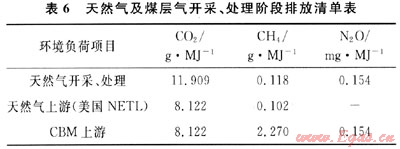 煤層氣(CBM)現(xiàn)階段總體利用率不高,分為地面抽采和井下抽采兩種。這里主要考慮具有大規(guī)模開(kāi)發(fā)價(jià)值的地面抽采,典型的CBM中CH4含量普遍在95%左右,取地面抽采利用率為70%。由于普遍缺乏CBM開(kāi)采與處理過(guò)程中的排放資料,這里參照天然氣的開(kāi)采階段清單,但甲烷排放量有所提高。參見(jiàn)表6。