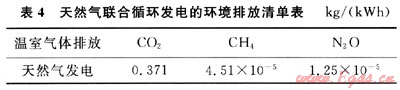 SNG發(fā)電同常規(guī)的天然氣發(fā)電。由于所占比例甚小,在忽略電廠建設(shè)用材、電廠建設(shè)及退役產(chǎn)生的氣體排放后,參照本文參考文獻(xiàn)[5,9]可得出天然氣聯(lián)合循環(huán)發(fā)電的環(huán)境排放清單,見(jiàn)表4。