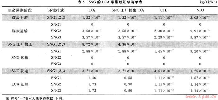 根據(jù)中國(guó)資源與市場(chǎng)分布的實(shí)際情況,這里考慮3種方案:①SNG工廠建址于煤礦坑口附近,通過(guò)1000km的長(zhǎng)輸管道運(yùn)輸至目標(biāo)市場(chǎng)(SNG1);②SNG工廠建目標(biāo)市場(chǎng)附近,通過(guò)1000km火車(chē)貨運(yùn)煤炭至SNG工廠(SNG2);③基本情況同②,但采用船運(yùn)(SNG3)。SNG工廠的加工轉(zhuǎn)換效率取52.6%,SNG發(fā)電效率取52%。SNG項(xiàng)目作為煤化工的一種,在C02捕集方面具有天生的優(yōu)勢(shì),如果按照可實(shí)現(xiàn)的捕集效率95%計(jì)算,則對(duì)SNG生命周期內(nèi)的碳排放帶來(lái)重大影響。SNG的LCA碳排放清單匯總結(jié)果見(jiàn)表5。